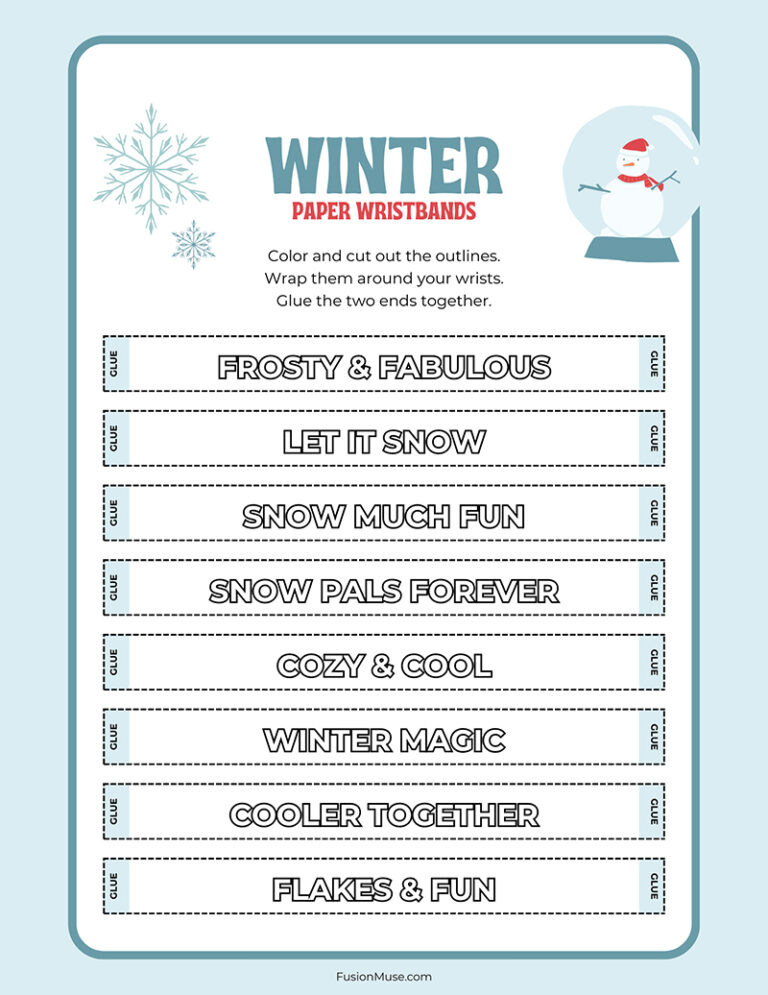 Bring some winter themed style to craft time with this fun paper wristband activity. Kids get to color, cut, and assemble their own festive bands, turning simple strips into cute wearable art. It is an easy hands on project that fits perfectly into classroom centers, winter parties, or creative afternoons at home.